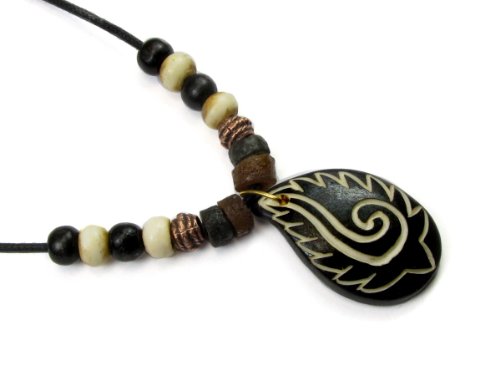 This is a pendant carved from genuine water buffalo bone of a symbolic teardrop Maori hook. The pendant is accented with African sandcast beads and bone beads. The items come on an adjustable cord slip knot necklace. See alternate picture for size perspective. The bone is from water buffalo bone from southeast Asia. The water buffalo are treated humanely and are not killed for jewelry or any other purpose. Enjoy the tribal look of organic bone along with the rich history of the Maori people. Read more customer reviews ...